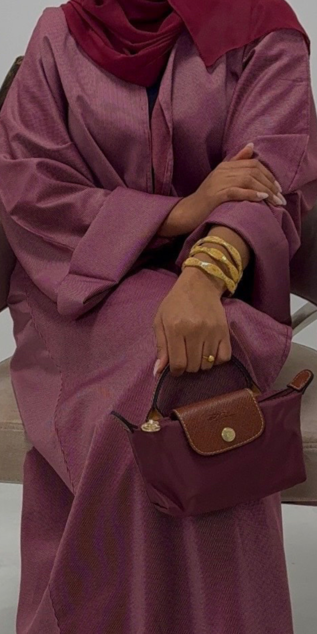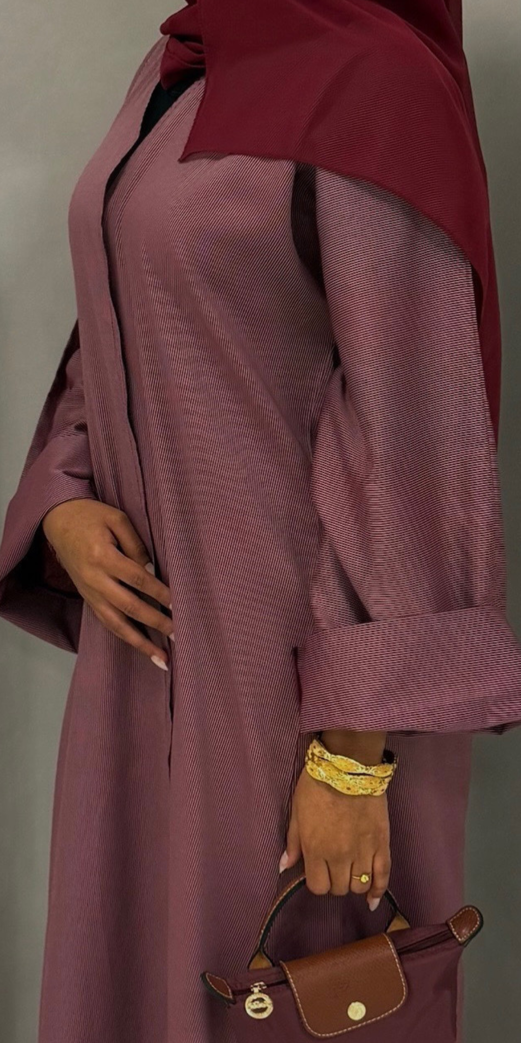 The Rose Abaya is a complete look; it comes paired with a perfectly matching maroon hijab for effortless styling.